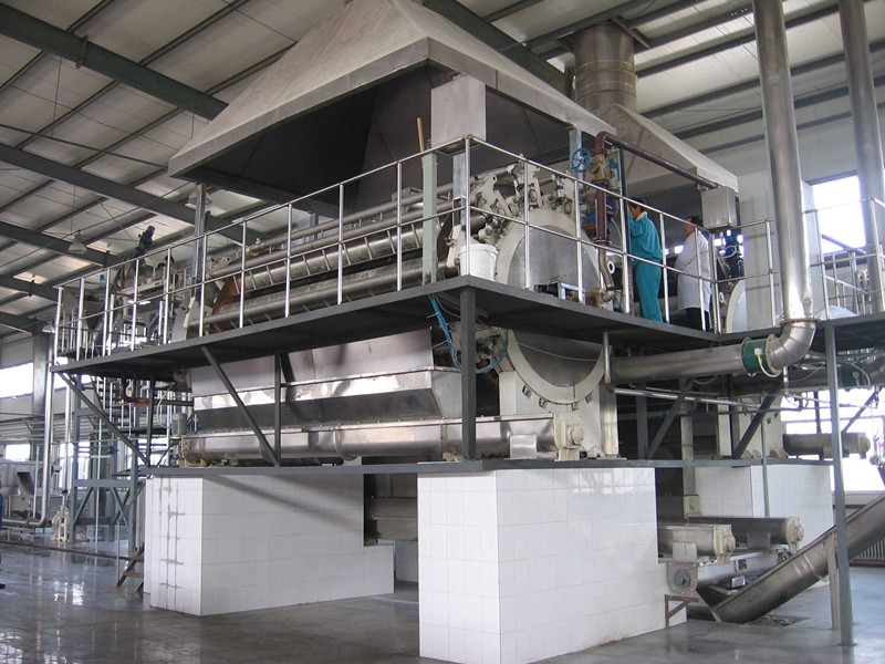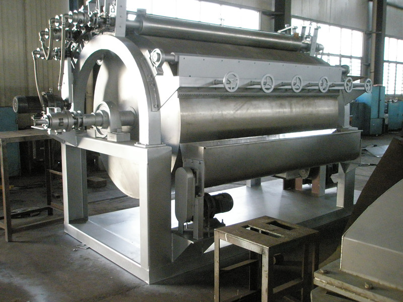 4、主滾筒在啟動(dòng)電機(jī)后運(yùn)轉(zhuǎn)平穩(wěn),然后將物料在溫度升高后加入,調(diào)整電機(jī)轉(zhuǎn)速及物料在滾筒上薄膜均勻程度來控制物料的最終含水量。