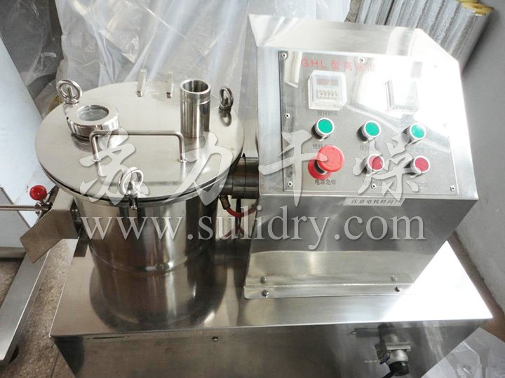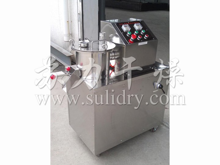 粉體物料與粘合劑在圓筒形容器中由底部混合漿充分混合成濕潤(rùn)軟材,然后由側(cè)置的高速粉碎槳切割成均勻的濕顆粒。